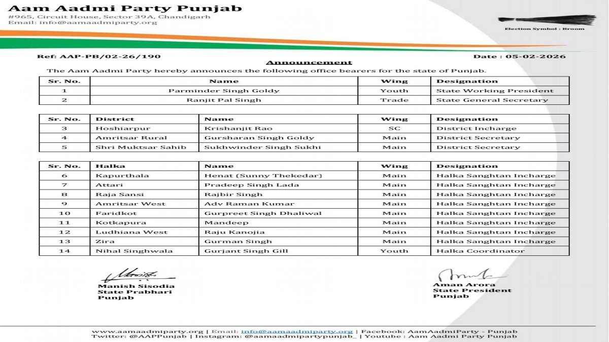 ज़िला स्तर पर कृष्णजीत राव को होशियारपुर के लिए एससी विंग का ज़िला इंचार्ज नियुक्त किया गया है। इसके अलावा, गुरशरण सिंह गोल्डी को अमृतसर देहाती का ज़िला सचिव और सुखविंदर सिंह सुखी को श्री मुक्तसर साहिब का ज़िला सचिव बनाया गया है।